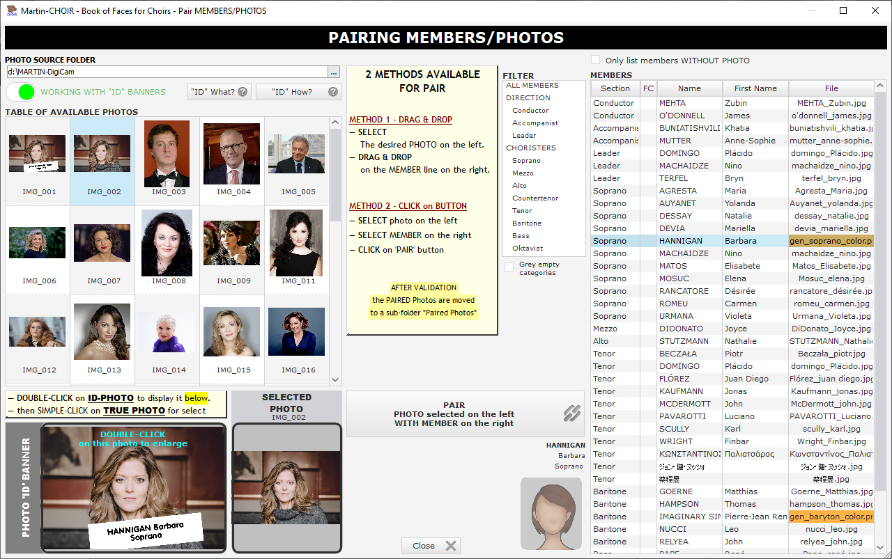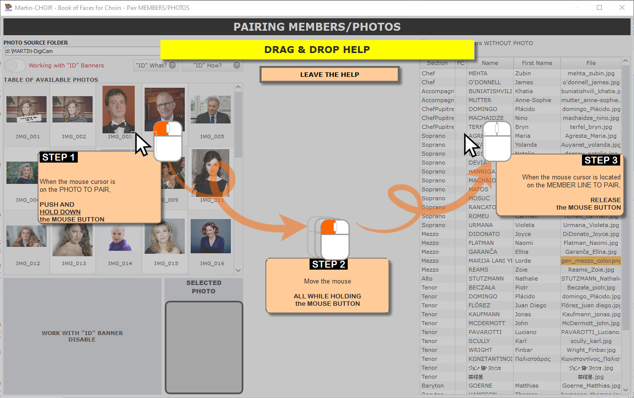 And this by a simple movement of the mouse "drag-and-drop" between the table of photos (from an APN) and the table of the members of the choir.