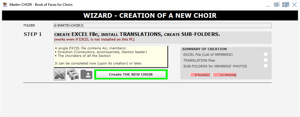 Martin-CHOIR allows you to manage multi-configuration choirs. Such cases occur for example if a Choir occurs in varying formats (number of choristers). Each configuration of the choir is then the subject of a different Excel file. All the Excel files of the same choir (all configurations) are grouped in the same folder.